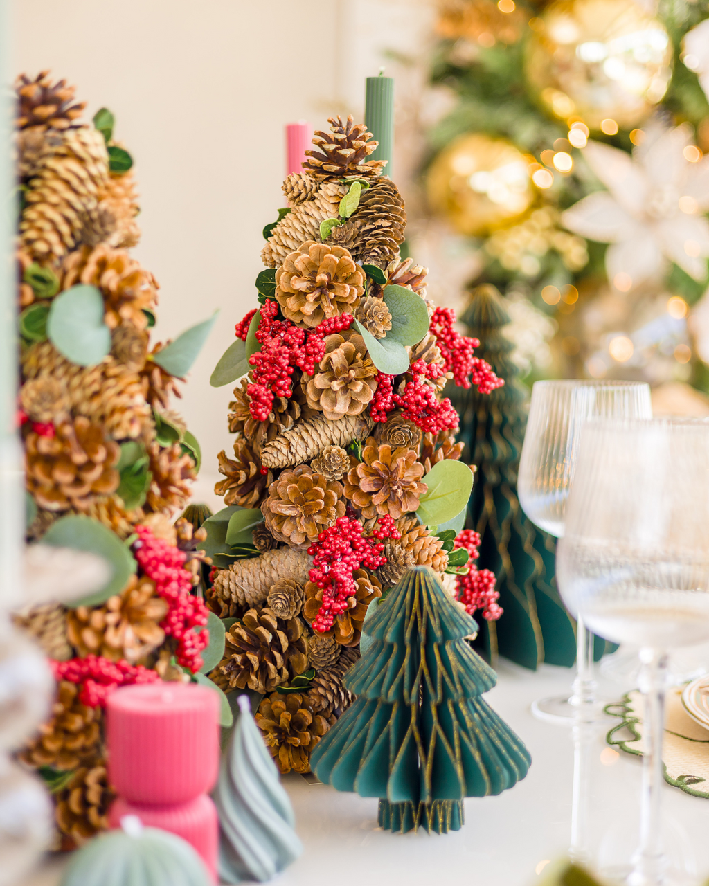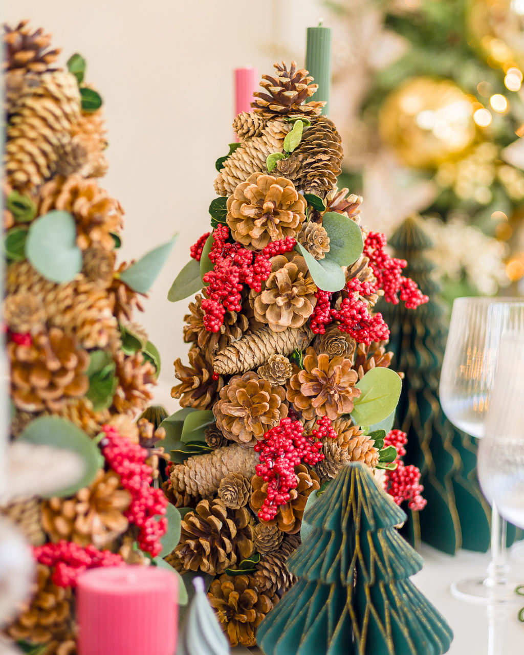 Decorada com pinhas naturais e detalhes em folhagens verdes