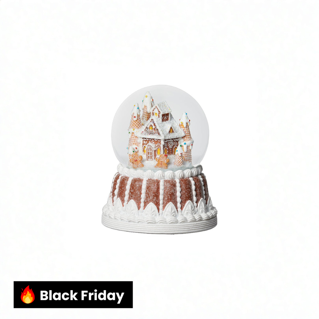 Este lindo globo de neve apresenta uma casinha de gengibre incrivelmente saborosa e lindamente decorada, aninhada em uma floresta de gengibre, com dois bonequinhos de gengibre do lado de fora. Este globo maravilhoso fica sobre uma base de gengibre que parece deliciosa o suficiente para ser comida!
