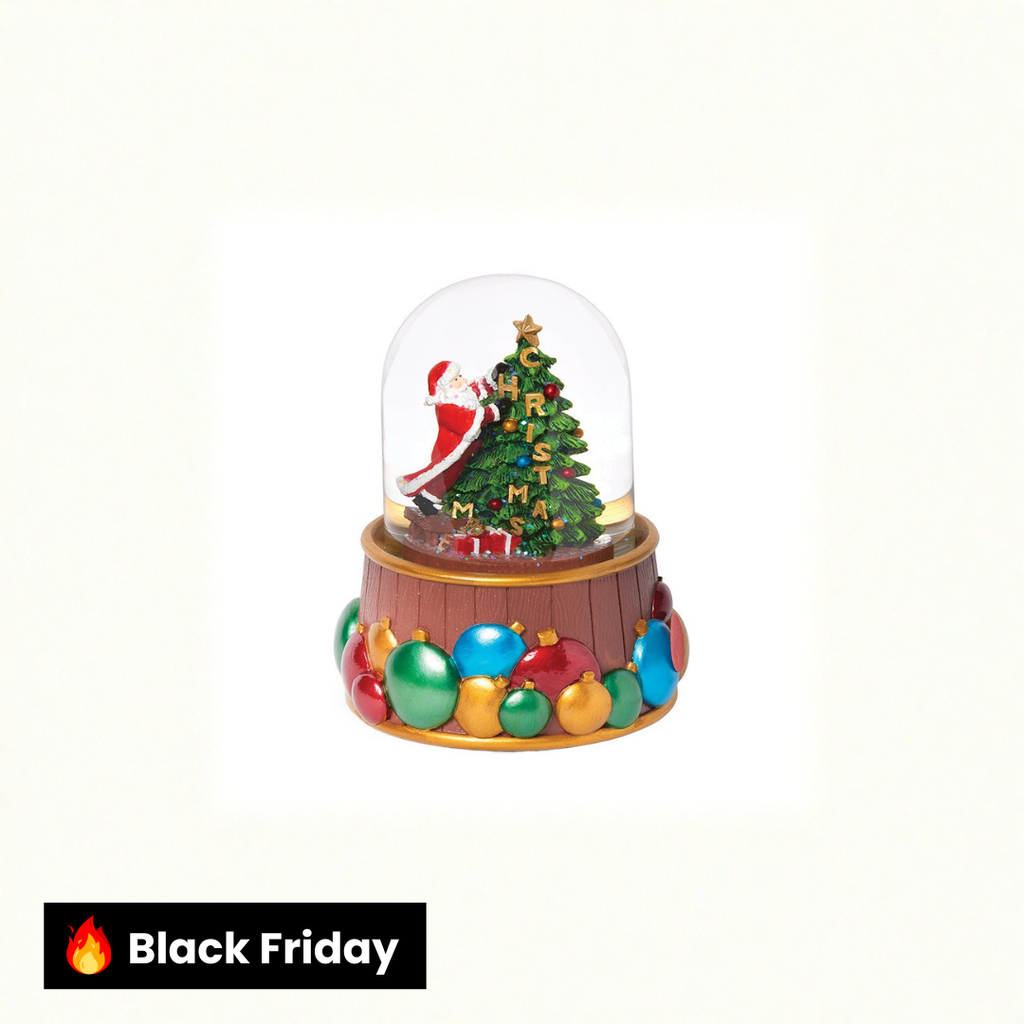 Este lindo globo de neve apresenta o Papai Noel decorando uma árvore de Natal com a palavra Natal caindo em letras douradas. O globo fica sobre uma base que parece ser feita de madeira, com pilhas de enfeites espalhados na base.