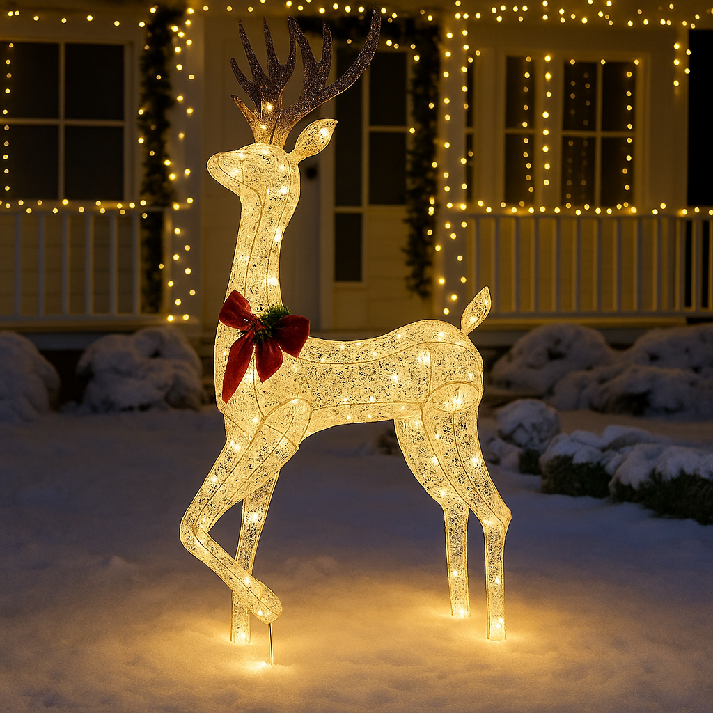 Este modelo premium acompanha um sistema suave de movimento que faz a cabeça do cervo balançar levemente para cima e para baixo, criando um efeito realista e encantador — especialmente quando combinado com as luzes LED.