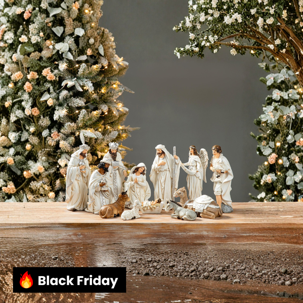 - Conjunto de presépio com 12 peças, incluindo a Sagrada Família, os Três Reis Magos, um pastor segurando um cordeiro e um anjo.